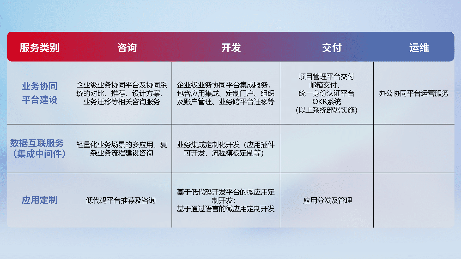 针对钉钉、、企微、、、、IDaas等平台级产品提供产品的规划、、、、方案、、、、交付、、、定制化开发等服务,,实现如统一协同办公、、、、智能客户服务、、混合会议管理、、智能数据查询、、、、等业务场景,,,,实现数字化转型。。。。