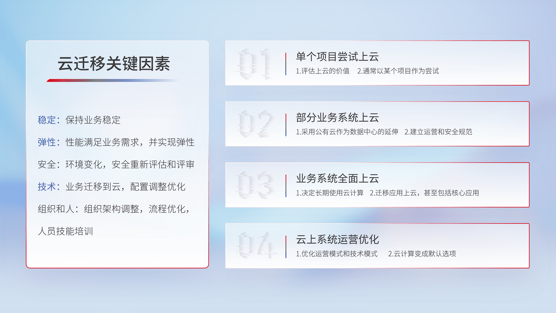 结合实际业务,,,,从规划设计、、、云平台选型、、云原生改造、、数据迁移、、集成交付,,迁移全过程为客户识别最佳上云路径,,,做好风险识别管理,,,,设计网络架构、、、、身份权限、、安全审计合规、、操作审计、、日志审计、、、监控告警策略、、、、多站点容灾设计等,,,对云上基础设施进行整体规划,,提升IT治理水平,,,以满足弹性、、高可用、、、高性能的需求。。